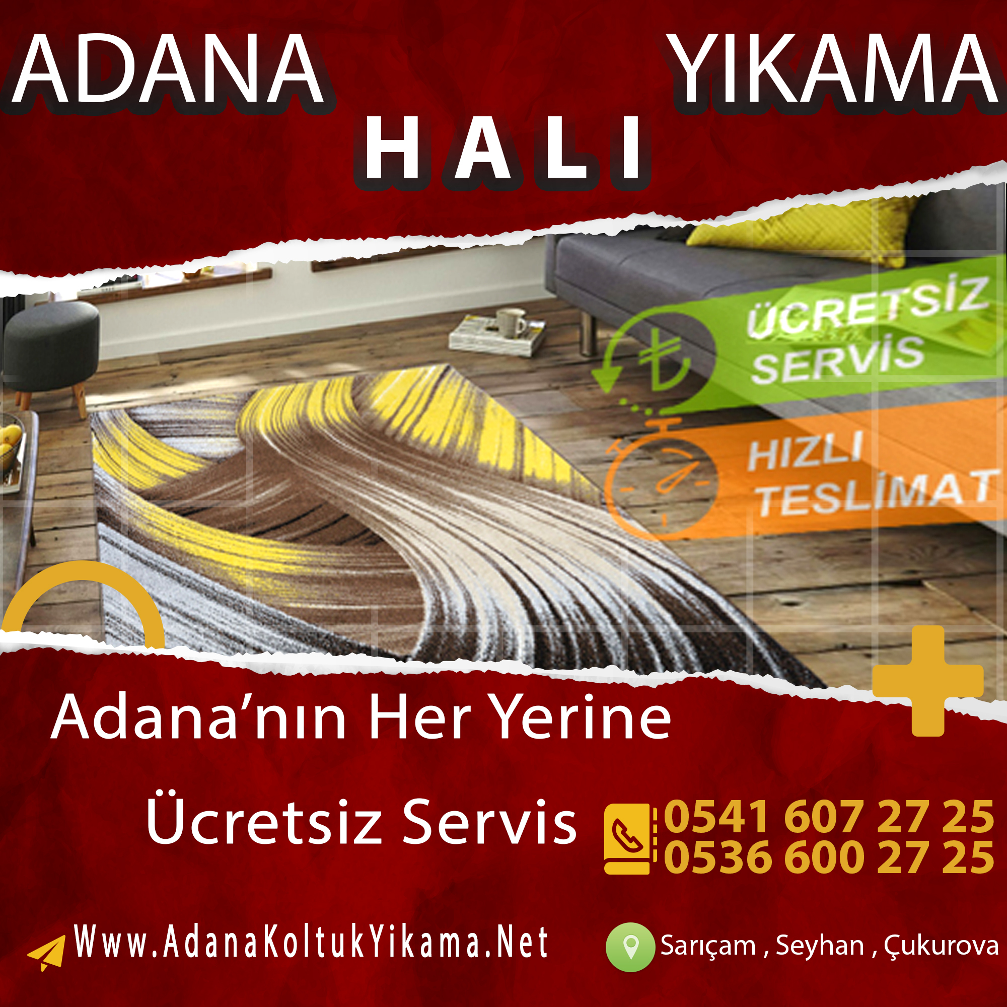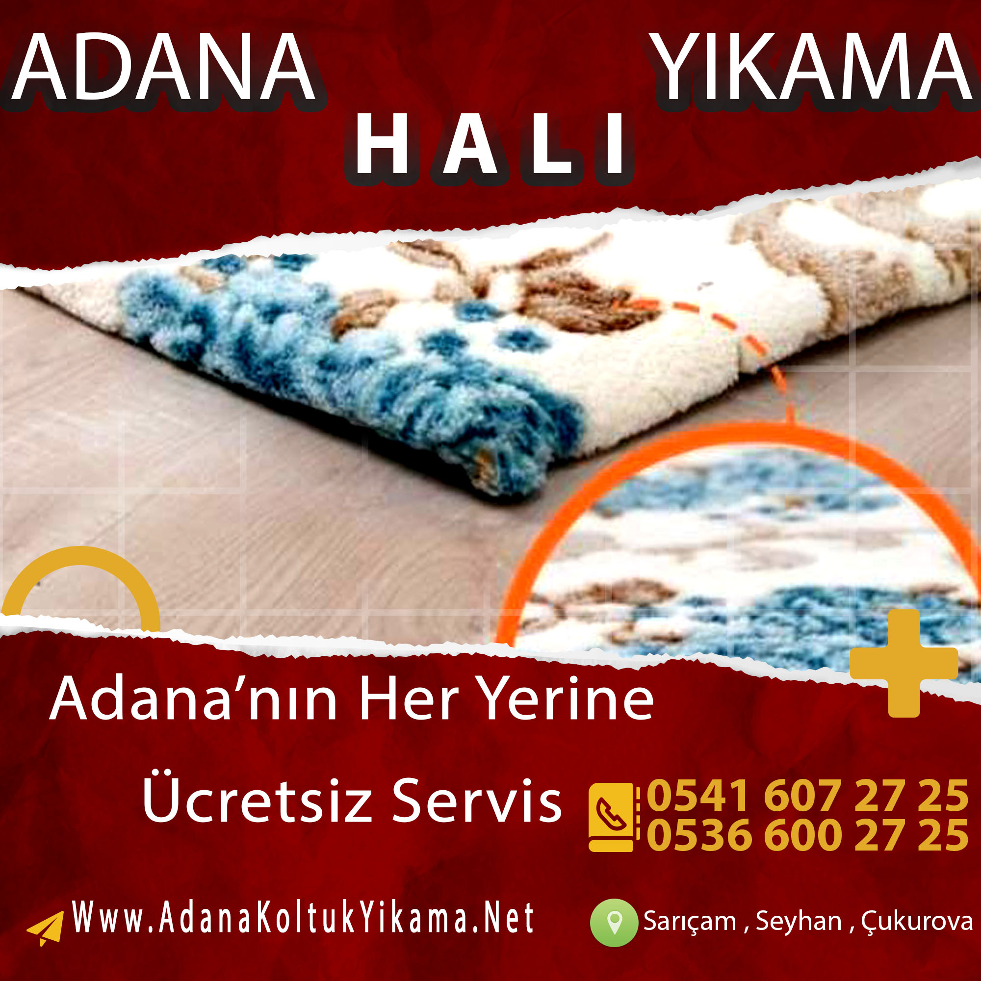 Sarıçam bölgesine ait tüm mahalleye hizmet veriyoruz. Halılarınızı istenilen adresten teslim alıyoruz. En iyi halı yıkama deterjanını kullanıyoruz.